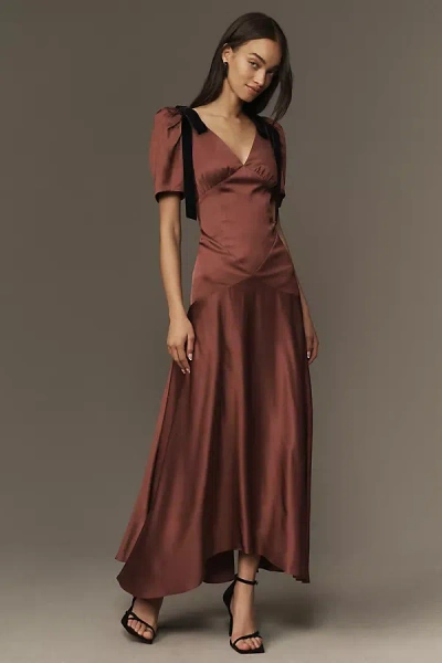 Bree Puff-sleeve V-neck Satin Midi Dress In Beige