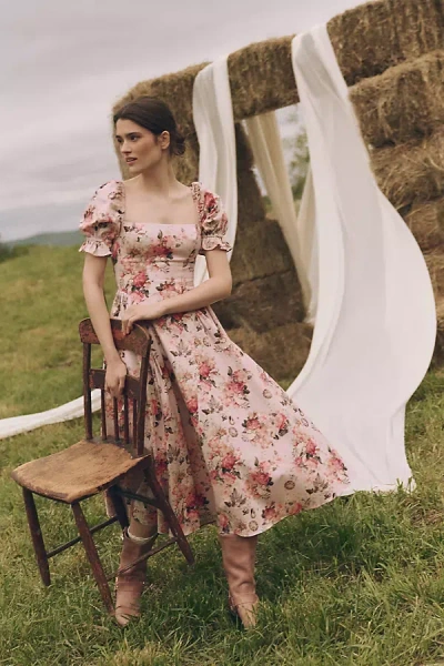 Square-neck Puff-sleeve A-line Midi Dress In Multi