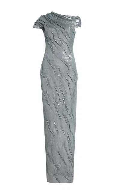 Marisol Embroidered Pleated Taffeta Gown In Blue