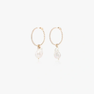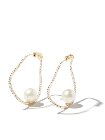 14k Yellow Gold Pearl Diamond Hoop Earrings In Metallic
