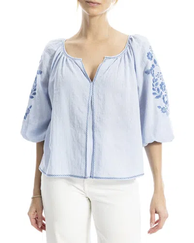 Embroidered V-neck Ballon Sleeve Blouse In Blue