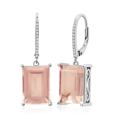 Sterling Silver Emerald Cut Quartz Dangle White Topaz Detail Leverback Earrings In Pink