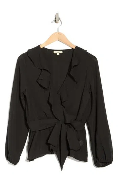Ruffle Long Sleeve Faux Wrap Top In Black