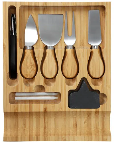 Bamboo Charcuterie And Cheese Board With Knife Stand Attachment And 4 Piece Knife Set In Brown