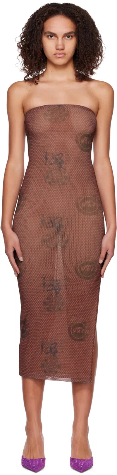 Lila Atlas Print Strapless Mesh Midi Dress In Black