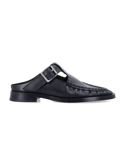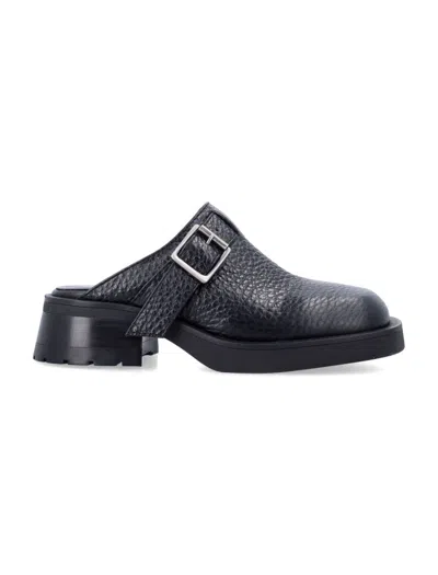 Buckle Chunky Heel Open Back Leather Mules In Black