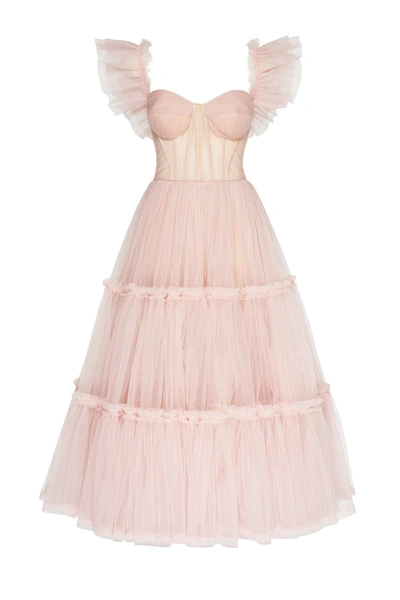 Misty Rose Ruffled Tulle Midi Dress In Pink