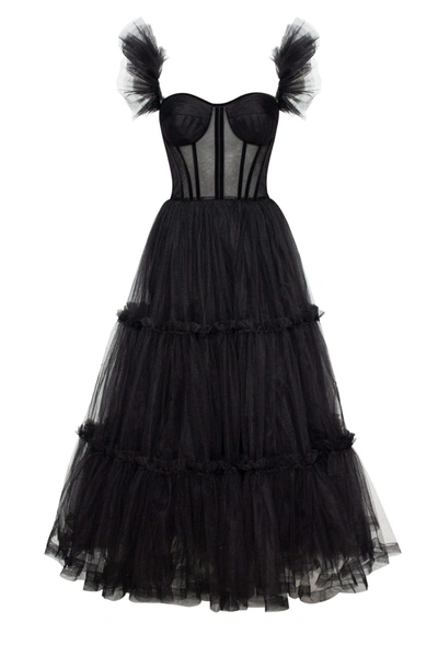 Black Ruffled Tulle Midi Dress