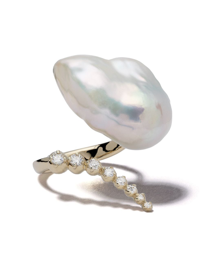 14kt Yellow Gold Curved Diamond And Pearl Ring