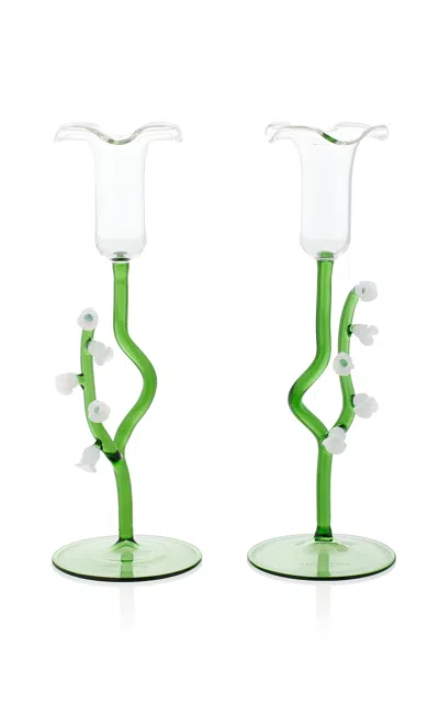 Lily Of The Valley Set-of-two Glass Candlesticks In Green