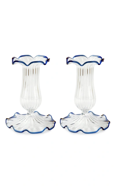 Set-of-two Small Scalloped Glass Candle Sticks In Blue
