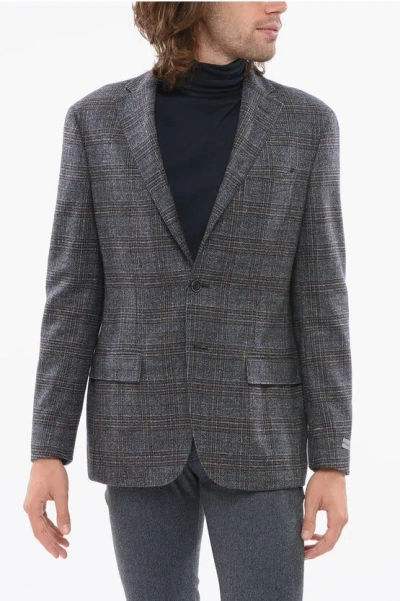Checkered Motif Wool Blend Single Breasted Blazer In Gray