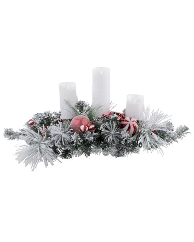 Triple Candle Holder With Flocked Pine & Christmas Ornaments In Multi