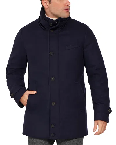 Down Filled Wool & Cashmere Herringbone Car Coat In British Blue Herringbone