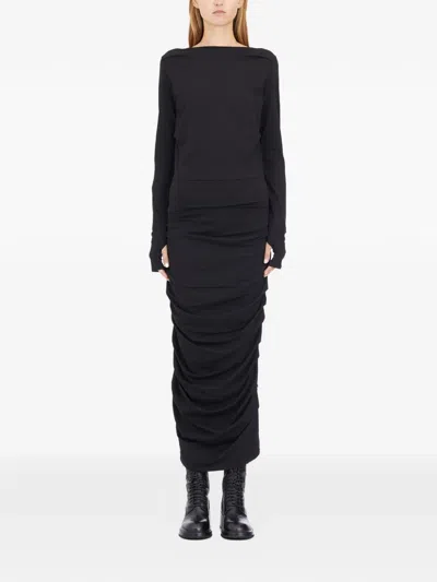 Long-sleeves Gathered Midi Dress In Black