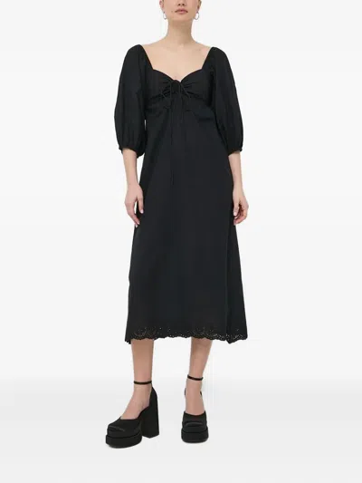 泡泡袖孔眼边饰中长连衣裙