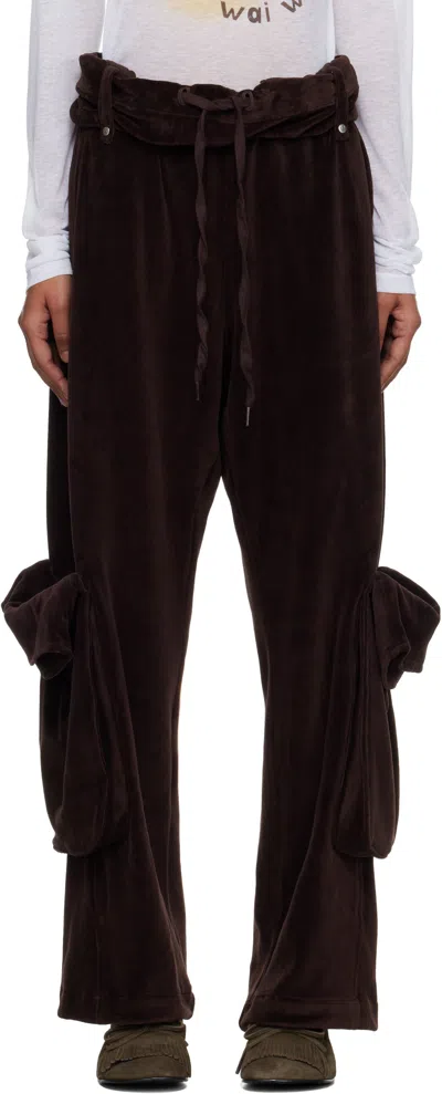 Brown Rolled Waist Velour Cargo Pants