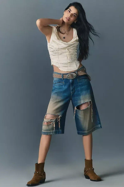 Destroyed Knee-length Washed Denim Shorts In Blue