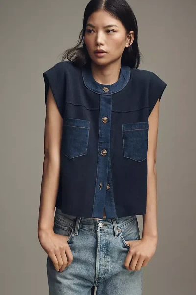 Denim Crewneck Cardigan Sweater Vest In Blue