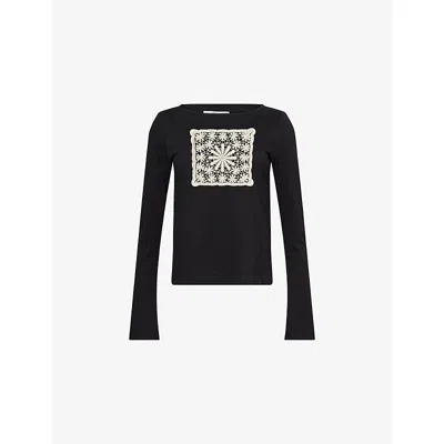 Womens Doilie Embroidered-patch Long-sleeve Cotton-jersey Top Black