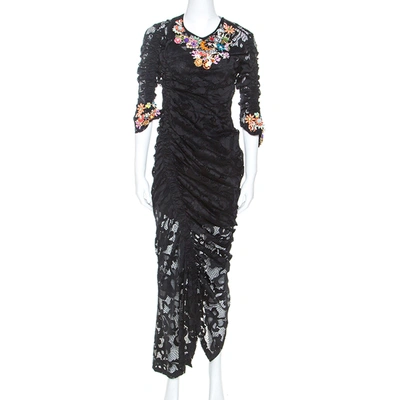 Pre-owned Black Stretch Lace Embellished Detail Ruched Georgia Dress L