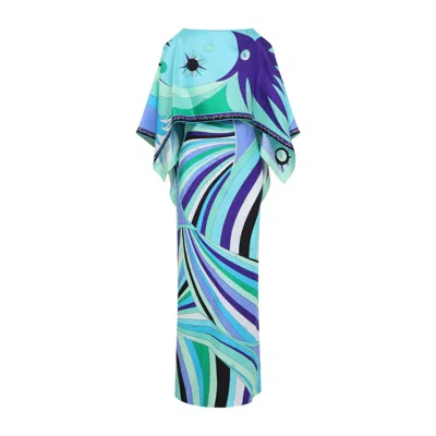 Iride Print Long Silk Dress With Cape In Multicolour