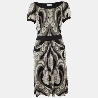 Pre-owned Grey/multicolor Printed Silk Knit Knee-length Dress L In Gray