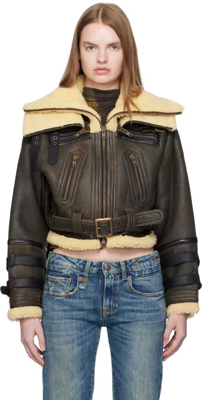 Tan Shirred Oversized Leather Bomber Jacket In Brown