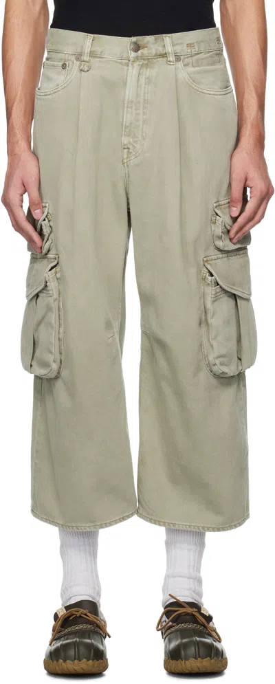 Green Cropped Multi Pocket Denim Cargo Pants In Olive Green Garm Dye