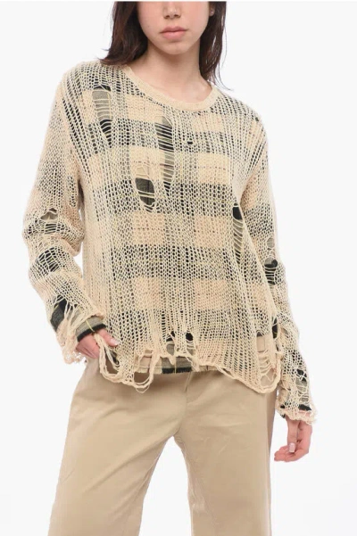Distressed Effect Crewneck Sweater With Checked Inner In Neutrals