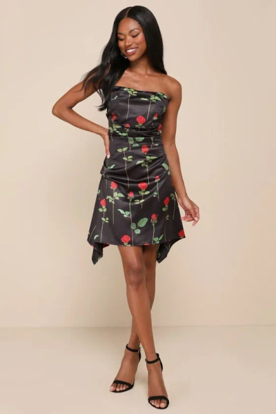Truly Refined Black Rose Print Satin Strapless Mini Dress