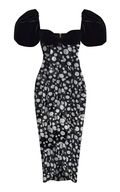 Puff-sleeve Floral Chiffon Midi Dress In Black,white