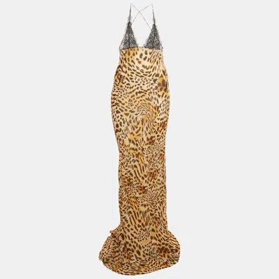 Pre-owned Brown /black Animal Print Crepe & Lace Akima Slip Dress L