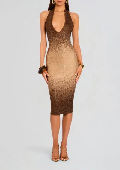 Charlize Strapless Coated Knit Bodycon Midi Dress In Gold