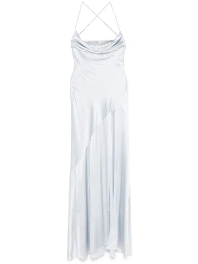 Julia Boat-neck Open-back Cape Satin Maxi Dress In Blue
