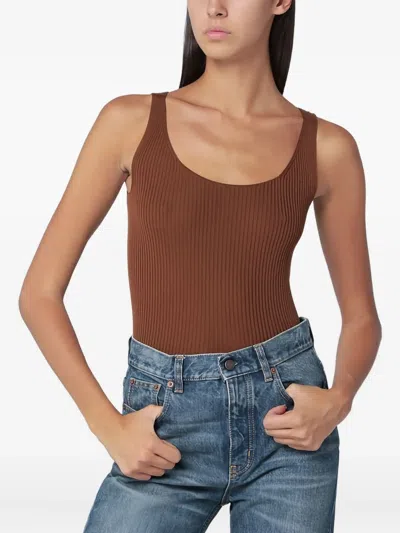 Cropped Ribbed Knit Sweater With Classic Crew Neckline In Brown