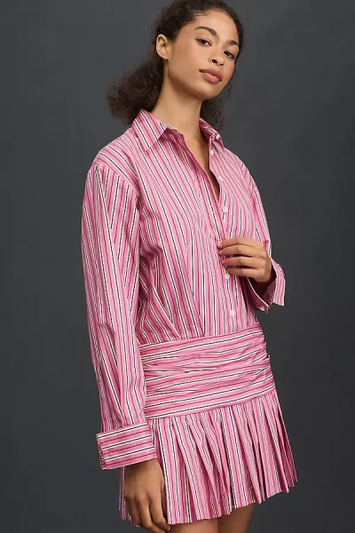 Long-sleeve Pleated Mini Shirt Dress In Pink