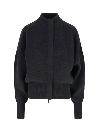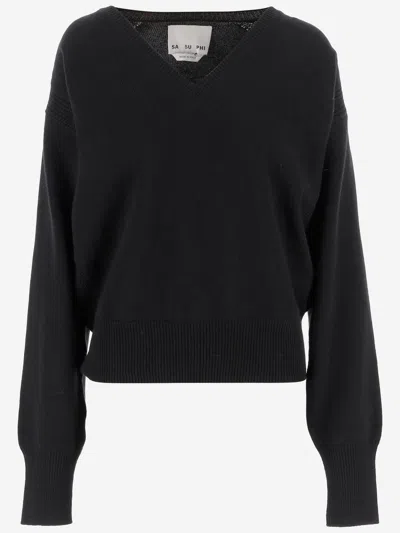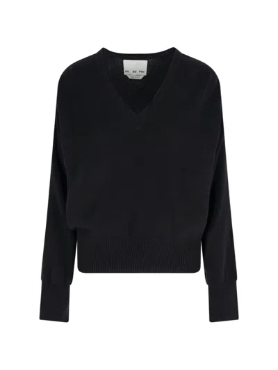 V Neck Knitwear Long Sleeve Ribbed Top In Black