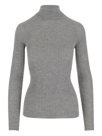 Ribbed Cashmere And Silk Knit Sweater With High Neckline In Gray