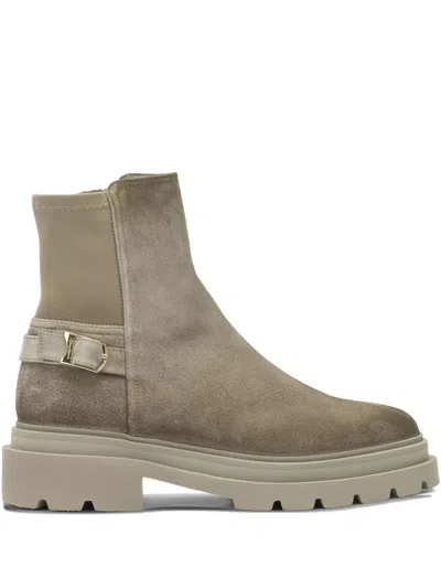 Suede Buckle Lug-sole Ankle Boots In Beige