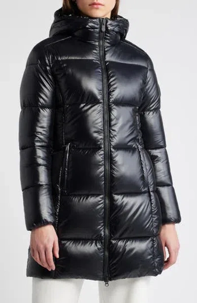 Ines Water Repellent Hooded Quilted Longline Puffer Coat In Black