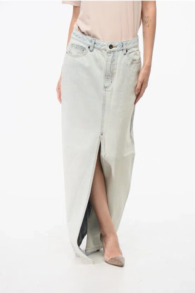 Bleached Effect Denim Maxi Skirt With Frontal Split In Gray