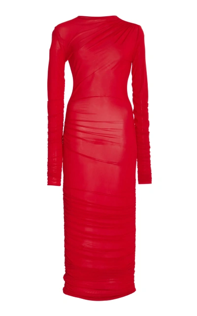 Sheer Ruched Stretch Wool Midi Dress In Red