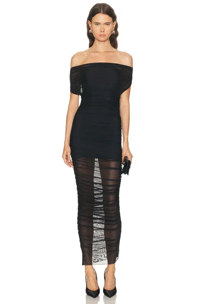 Noel Off-shoulder Ruched Mesh Midi Dress In Black