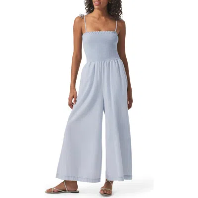 Smock Bodice Wide Leg Cotton Blend Jumpsuit In Washed Indigo