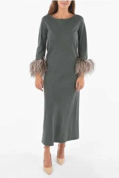 Silk Maxi Dress With Feathers On Bottom Sleeves In Gray