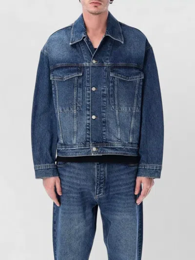 Denim Jacket Long Sleeves Point Collar Pockets In Blue