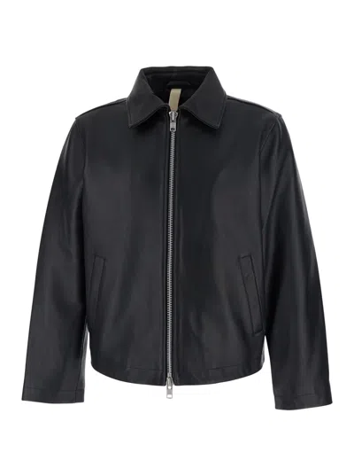 Black Crop Jacket With Classic Collar And Dropped Shoulders In Leather Man In Blue