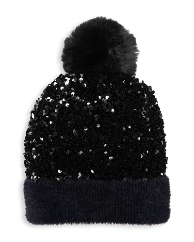 Girls' Knit Sequin Beanie Hat With Faux Fur Pom - Big Kid In Black