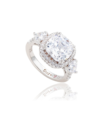 Sterling Silver Cubic Zirconia White Three Stones Halo Engagement Ring In Metallic